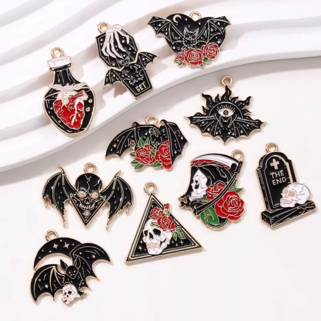 10pcs Halloween Gothic Charms – Skull, Rose, Bat & Heart Enamel Pendants