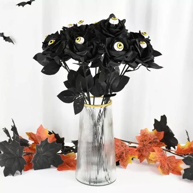Each flower features a realistic black silk rose paired with a creepy faux eyeball nestled in the center – a striking and unsettling combination that draws attention instantly. Crafted from high-quality silk material, the petals have a soft, lifelike feel, while the detailed eyeball offers a blood-curdling surprise. Measuring approximately 11.8 inches in length, these spooky stems are perfect for floral arrangements, vases, or DIY Halloween crafts.
