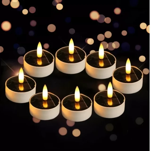 • Solar-Powered: Equipped with a built-in solar panel, these tea lights absorb solar energy during the day and automatically light up at night, making them hassle-free and energy-efficient.