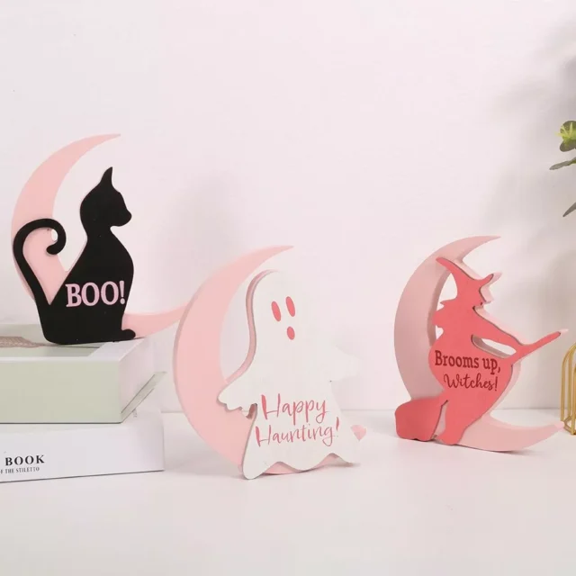 Wooden Moon Witch Halloween Decoration with Black Cat Ornament